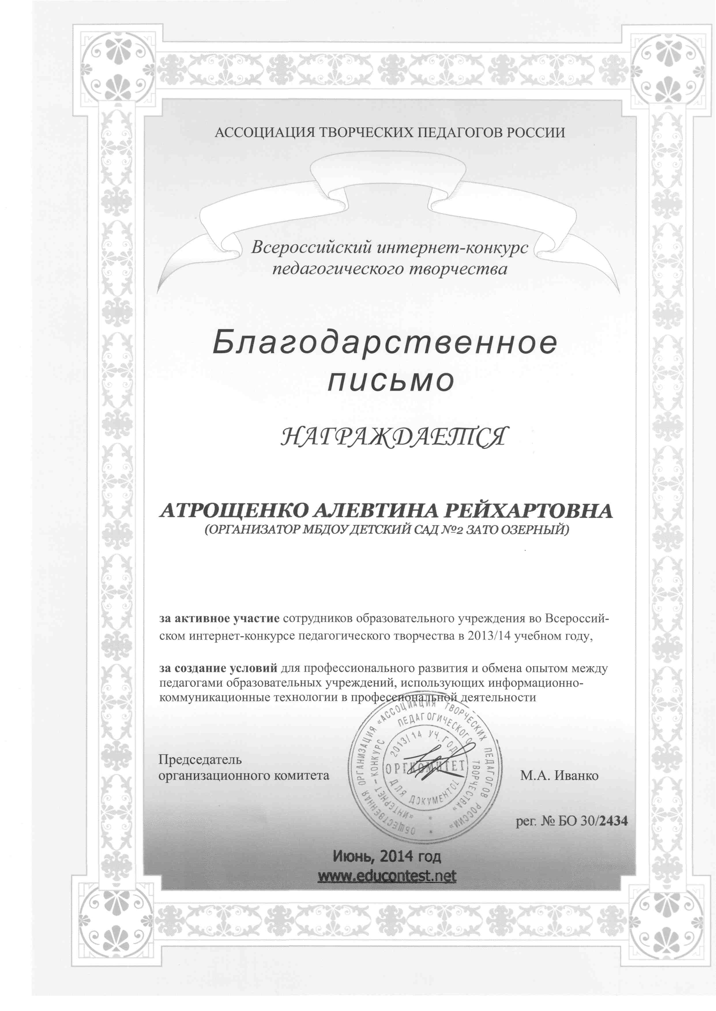 Муниципальное бюджетное дошкольное образовательное учреждение детский сад № 2 ЗАТО Озерный Тверской области